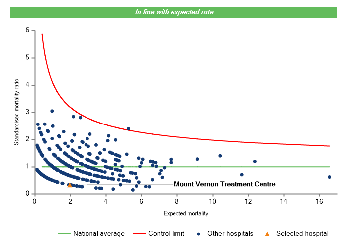 The vertical axis figures are presented as a standardised mortality ratio. This means the values do not represent percentages of patients who have died, but they represent the proportion of deaths compared to the national average. The data is also ‘risk adjusted’ to take account of the fact that different hospitals may operate on more higher-risk or lower-risk patients e.g. because of demographics in the patient population they work with.