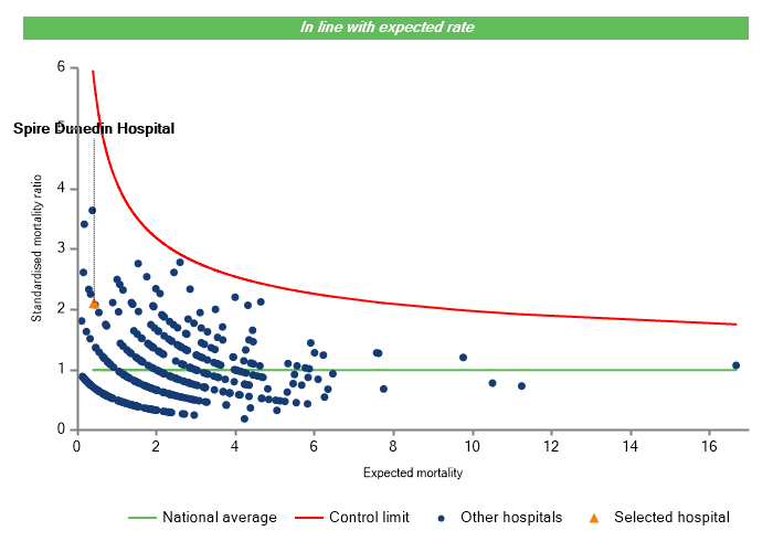 The vertical axis figures are presented as a standardised mortality ratio. This means the values do not represent percentages of patients who have died, but they represent the proportion of deaths compared to the national average. The data is also ‘risk adjusted’ to take account of the fact that different hospitals may operate on more higher-risk or lower-risk patients e.g. because of demographics in the patient population they work with.