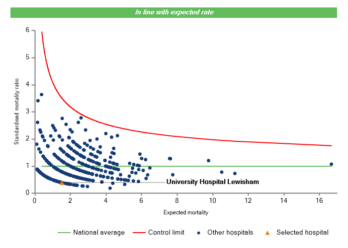 The vertical axis figures are presented as a standardised mortality ratio. This means the values do not represent percentages of patients who have died, but they represent the proportion of deaths compared to the national average. The data is also ‘risk adjusted’ to take account of the fact that different hospitals may operate on more higher-risk or lower-risk patients e.g. because of demographics in the patient population they work with.