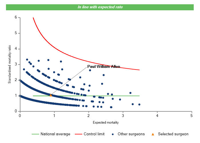 The vertical axis figures are presented as a standardised mortality ratio. This means the values do not represent percentages of patients who have died, but they represent the proportion of deaths compared to the national average. The data is also risk adjusted to take account of the fact that different surgeons may operate on more higher-risk or lower-risk patients e.g. because of demographics in the patient population they work with.