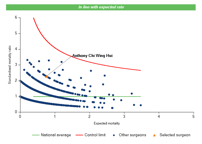 The vertical axis figures are presented as a standardised mortality ratio. This means the values do not represent percentages of patients who have died, but they represent the proportion of deaths compared to the national average. The data is also risk adjusted to take account of the fact that different surgeons may operate on more higher-risk or lower-risk patients e.g. because of demographics in the patient population they work with.
