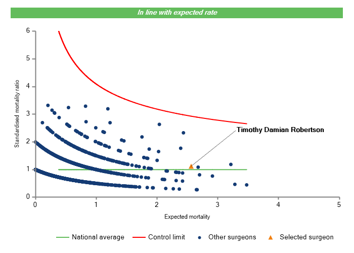 The vertical axis figures are presented as a standardised mortality ratio. This means the values do not represent percentages of patients who have died, but they represent the proportion of deaths compared to the national average. The data is also risk adjusted to take account of the fact that different surgeons may operate on more higher-risk or lower-risk patients e.g. because of demographics in the patient population they work with.