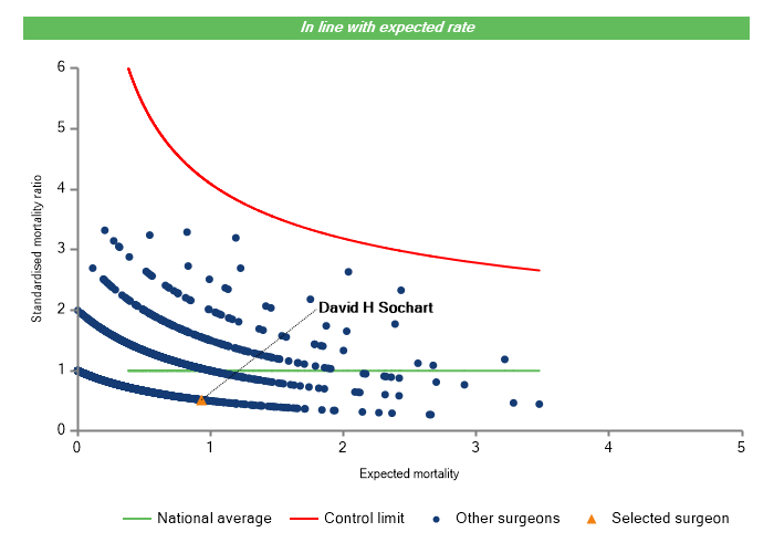 The vertical axis figures are presented as a standardised mortality ratio. This means the values do not represent percentages of patients who have died, but they represent the proportion of deaths compared to the national average. The data is also risk adjusted to take account of the fact that different surgeons may operate on more higher-risk or lower-risk patients e.g. because of demographics in the patient population they work with.