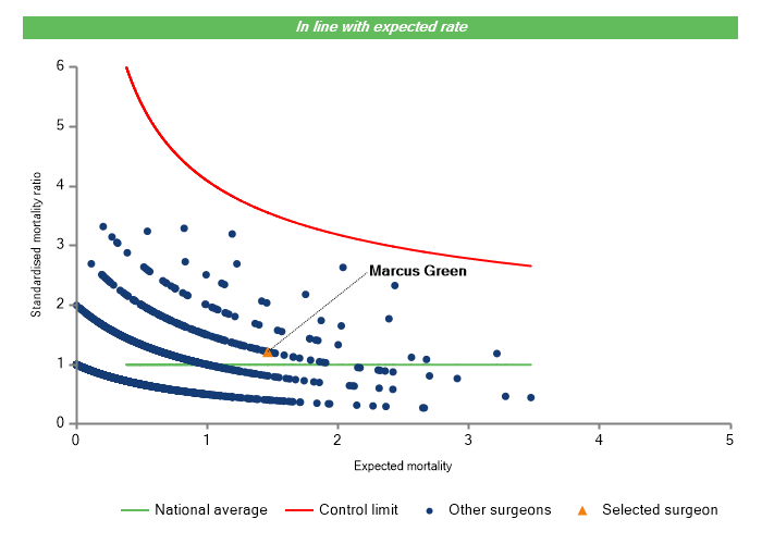 The vertical axis figures are presented as a standardised mortality ratio. This means the values do not represent percentages of patients who have died, but they represent the proportion of deaths compared to the national average. The data is also risk adjusted to take account of the fact that different surgeons may operate on more higher-risk or lower-risk patients e.g. because of demographics in the patient population they work with.