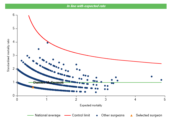 The vertical axis figures are presented as a standardised mortality ratio. This means the values do not represent percentages of patients who have died, but they represent the proportion of deaths compared to the national average. The data is also risk adjusted to take account of the fact that different surgeons may operate on more higher-risk or lower-risk patients e.g. because of demographics in the patient population they work with.