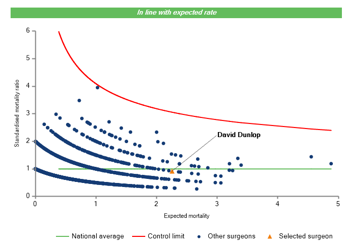 The vertical axis figures are presented as a standardised mortality ratio. This means the values do not represent percentages of patients who have died, but they represent the proportion of deaths compared to the national average. The data is also risk adjusted to take account of the fact that different surgeons may operate on more higher-risk or lower-risk patients e.g. because of demographics in the patient population they work with.