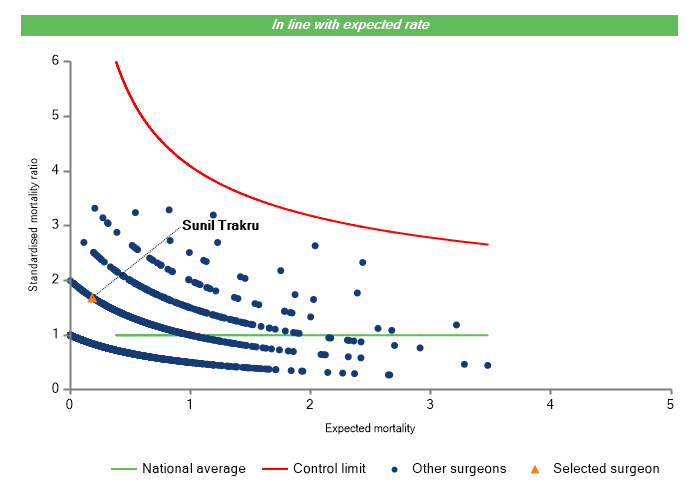 The vertical axis figures are presented as a standardised mortality ratio. This means the values do not represent percentages of patients who have died, but they represent the proportion of deaths compared to the national average. The data is also risk adjusted to take account of the fact that different surgeons may operate on more higher-risk or lower-risk patients e.g. because of demographics in the patient population they work with.