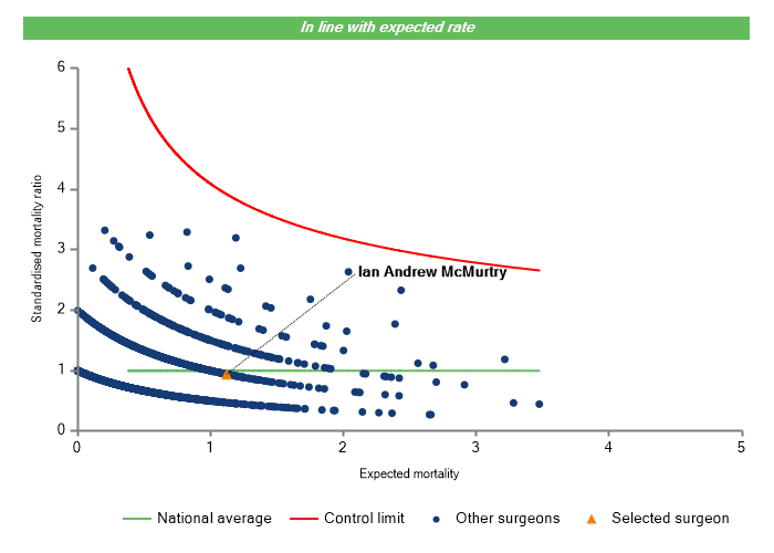 The vertical axis figures are presented as a standardised mortality ratio. This means the values do not represent percentages of patients who have died, but they represent the proportion of deaths compared to the national average. The data is also risk adjusted to take account of the fact that different surgeons may operate on more higher-risk or lower-risk patients e.g. because of demographics in the patient population they work with.