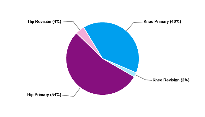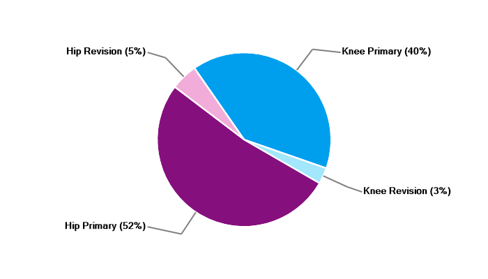 Primary hip replacement Revision hip replacement Primary total knee replacement Primary unicondylar (partial) knee replacement Revision knee replacement |