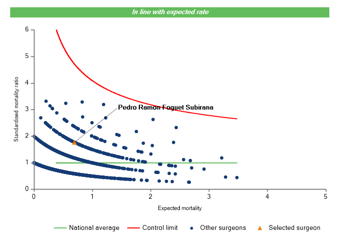 The vertical axis figures are presented as a standardised mortality ratio. This means the values do not represent percentages of patients who have died, but they represent the proportion of deaths compared to the national average. The data is also risk adjusted to take account of the fact that different surgeons may operate on more higher-risk or lower-risk patients e.g. because of demographics in the patient population they work with.