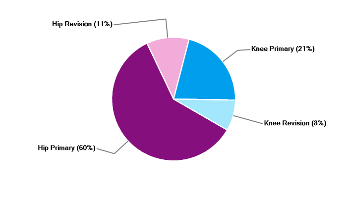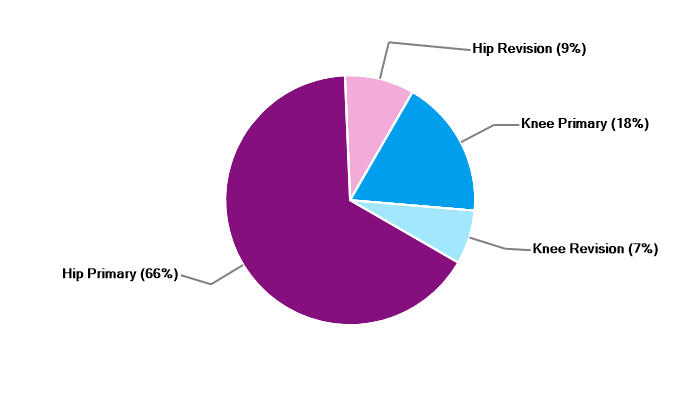 Primary hip replacement Revision hip replacement Primary total knee replacement Primary unicondylar (partial) knee replacement Primary patello-femoral replacement Revision knee replacement |