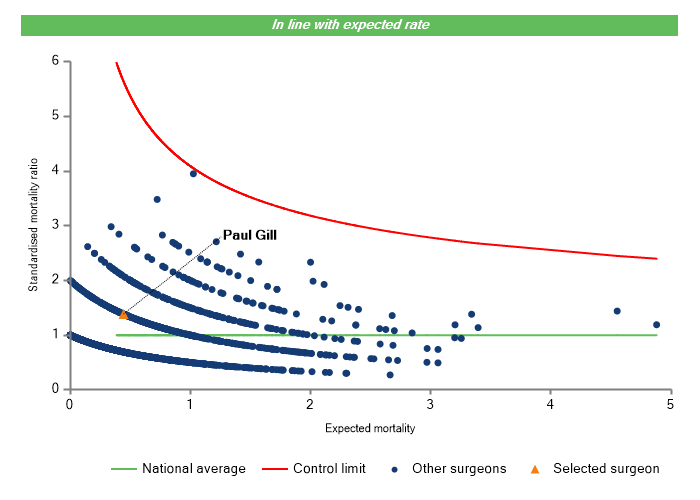 The vertical axis figures are presented as a standardised mortality ratio. This means the values do not represent percentages of patients who have died, but they represent the proportion of deaths compared to the national average. The data is also risk adjusted to take account of the fact that different surgeons may operate on more higher-risk or lower-risk patients e.g. because of demographics in the patient population they work with.