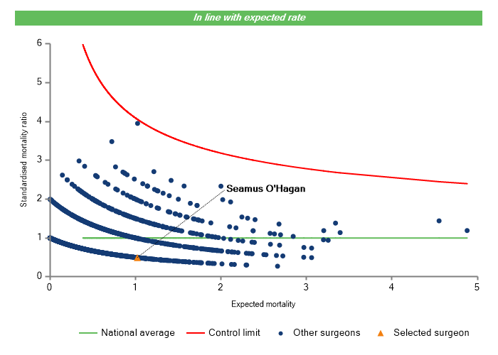The vertical axis figures are presented as a standardised mortality ratio. This means the values do not represent percentages of patients who have died, but they represent the proportion of deaths compared to the national average. The data is also risk adjusted to take account of the fact that different surgeons may operate on more higher-risk or lower-risk patients e.g. because of demographics in the patient population they work with.