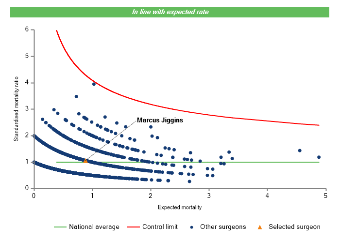 The vertical axis figures are presented as a standardised mortality ratio. This means the values do not represent percentages of patients who have died, but they represent the proportion of deaths compared to the national average. The data is also risk adjusted to take account of the fact that different surgeons may operate on more higher-risk or lower-risk patients e.g. because of demographics in the patient population they work with.