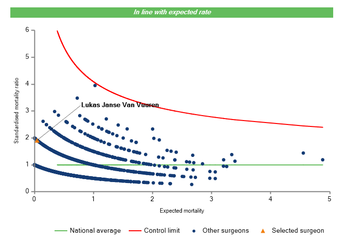 The vertical axis figures are presented as a standardised mortality ratio. This means the values do not represent percentages of patients who have died, but they represent the proportion of deaths compared to the national average. The data is also risk adjusted to take account of the fact that different surgeons may operate on more higher-risk or lower-risk patients e.g. because of demographics in the patient population they work with.