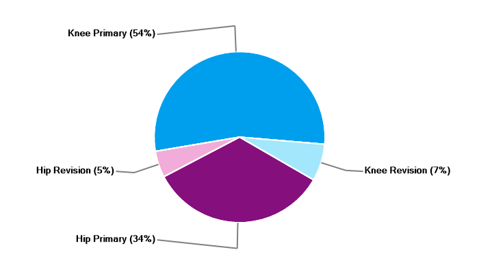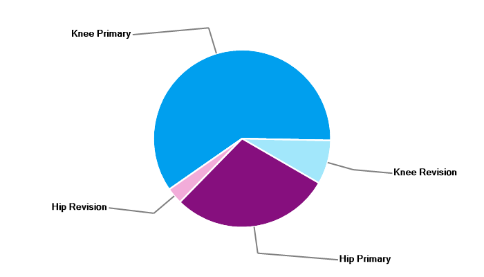 Primary hip replacement Revision hip replacement Primary total knee replacement Primary unicondylar (partial) knee replacement Primary patello-femoral replacement Revision knee replacement |