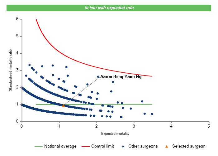 The vertical axis figures are presented as a standardised mortality ratio. This means the values do not represent percentages of patients who have died, but they represent the proportion of deaths compared to the national average. The data is also risk adjusted to take account of the fact that different surgeons may operate on more higher-risk or lower-risk patients e.g. because of demographics in the patient population they work with.