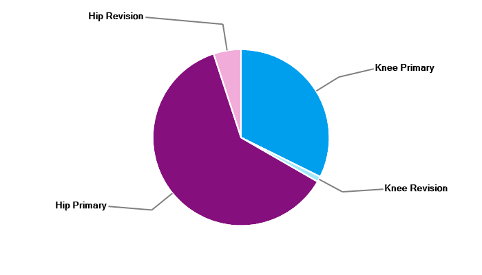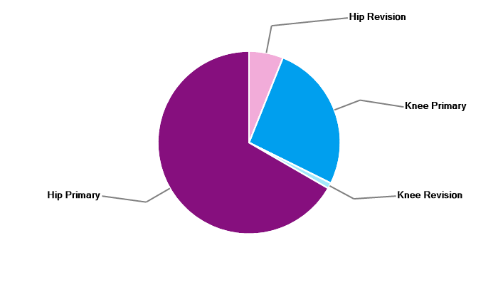 Primary hip replacement Revision hip replacement Primary total knee replacement Primary unicondylar (partial) knee replacement Primary patello-femoral replacement Revision knee replacement |