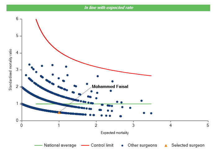 The vertical axis figures are presented as a standardised mortality ratio. This means the values do not represent percentages of patients who have died, but they represent the proportion of deaths compared to the national average. The data is also risk adjusted to take account of the fact that different surgeons may operate on more higher-risk or lower-risk patients e.g. because of demographics in the patient population they work with.