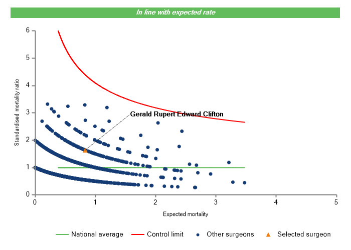 The vertical axis figures are presented as a standardised mortality ratio. This means the values do not represent percentages of patients who have died, but they represent the proportion of deaths compared to the national average. The data is also risk adjusted to take account of the fact that different surgeons may operate on more higher-risk or lower-risk patients e.g. because of demographics in the patient population they work with.