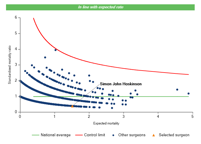 The vertical axis figures are presented as a standardised mortality ratio. This means the values do not represent percentages of patients who have died, but they represent the proportion of deaths compared to the national average. The data is also risk adjusted to take account of the fact that different surgeons may operate on more higher-risk or lower-risk patients e.g. because of demographics in the patient population they work with.