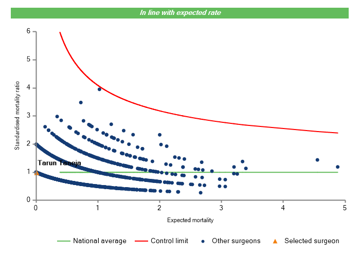 The vertical axis figures are presented as a standardised mortality ratio. This means the values do not represent percentages of patients who have died, but they represent the proportion of deaths compared to the national average. The data is also risk adjusted to take account of the fact that different surgeons may operate on more higher-risk or lower-risk patients e.g. because of demographics in the patient population they work with.