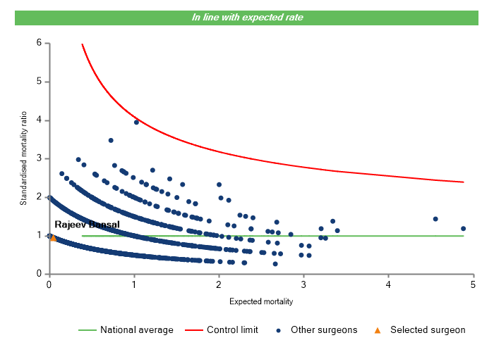 The vertical axis figures are presented as a standardised mortality ratio. This means the values do not represent percentages of patients who have died, but they represent the proportion of deaths compared to the national average. The data is also risk adjusted to take account of the fact that different surgeons may operate on more higher-risk or lower-risk patients e.g. because of demographics in the patient population they work with.