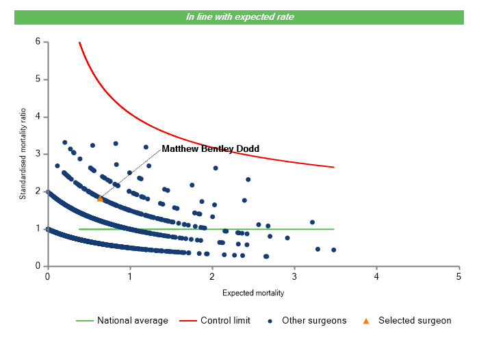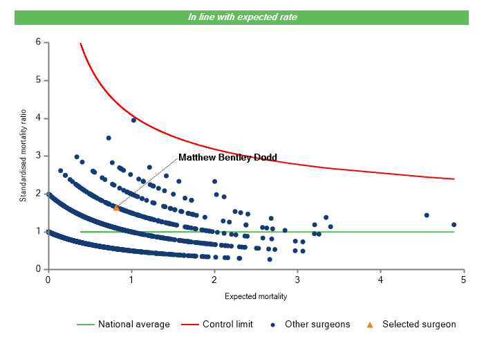 The vertical axis figures are presented as a standardised mortality ratio. This means the values do not represent percentages of patients who have died, but they represent the proportion of deaths compared to the national average. The data is also risk adjusted to take account of the fact that different surgeons may operate on more higher-risk or lower-risk patients e.g. because of demographics in the patient population they work with.