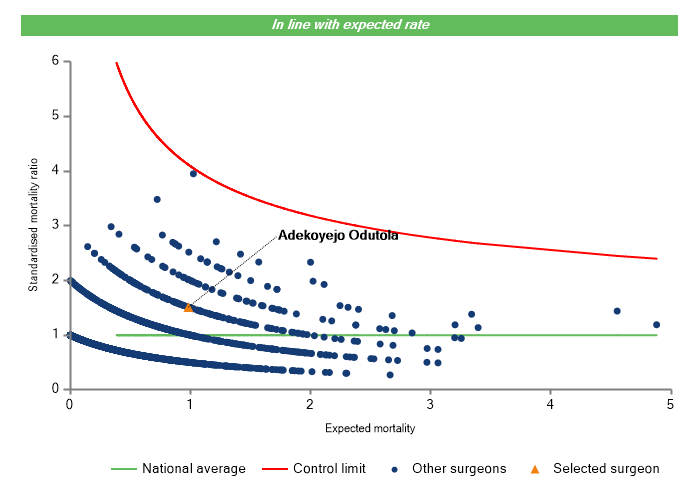 The vertical axis figures are presented as a standardised mortality ratio. This means the values do not represent percentages of patients who have died, but they represent the proportion of deaths compared to the national average. The data is also risk adjusted to take account of the fact that different surgeons may operate on more higher-risk or lower-risk patients e.g. because of demographics in the patient population they work with.