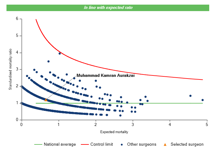 The vertical axis figures are presented as a standardised mortality ratio. This means the values do not represent percentages of patients who have died, but they represent the proportion of deaths compared to the national average. The data is also risk adjusted to take account of the fact that different surgeons may operate on more higher-risk or lower-risk patients e.g. because of demographics in the patient population they work with.