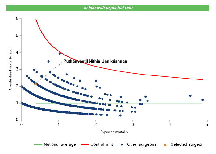 The vertical axis figures are presented as a standardised mortality ratio. This means the values do not represent percentages of patients who have died, but they represent the proportion of deaths compared to the national average. The data is also risk adjusted to take account of the fact that different surgeons may operate on more higher-risk or lower-risk patients e.g. because of demographics in the patient population they work with.