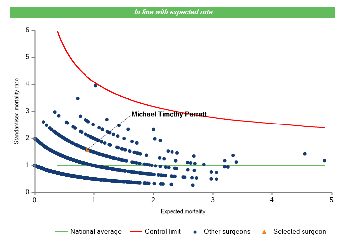 The vertical axis figures are presented as a standardised mortality ratio. This means the values do not represent percentages of patients who have died, but they represent the proportion of deaths compared to the national average. The data is also risk adjusted to take account of the fact that different surgeons may operate on more higher-risk or lower-risk patients e.g. because of demographics in the patient population they work with.