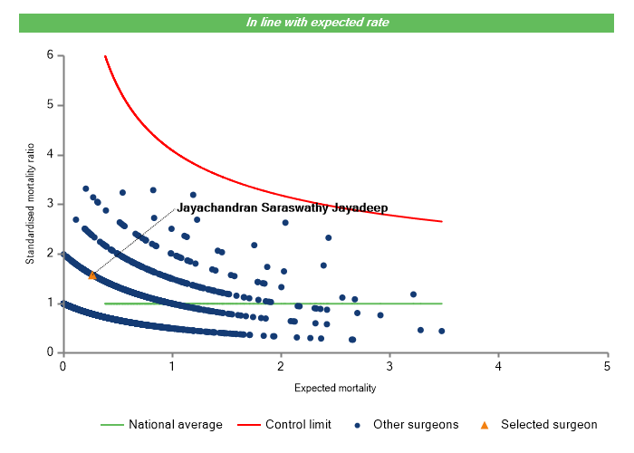 The vertical axis figures are presented as a standardised mortality ratio. This means the values do not represent percentages of patients who have died, but they represent the proportion of deaths compared to the national average. The data is also risk adjusted to take account of the fact that different surgeons may operate on more higher-risk or lower-risk patients e.g. because of demographics in the patient population they work with.