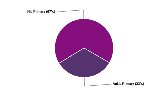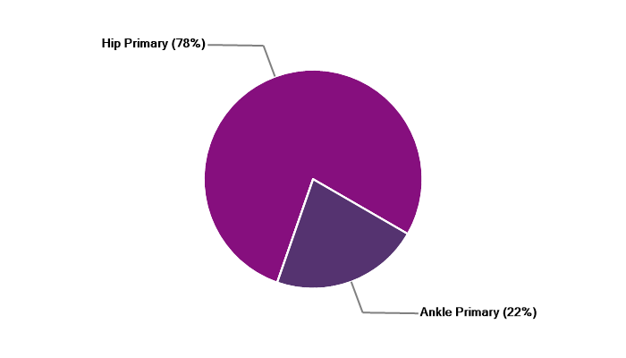 This information display shows overall characteristics for first-time ankle replacement patients treated by this surgeon between 1 April 2010 and 31 March 2024. Against each characteristic you will be able to see whether this surgeon has been responsible for a greater or fewer number of patients of a particular type. This surgeon is represented on the chart by the black marker ().