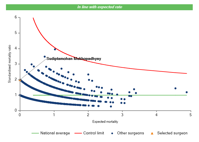 The vertical axis figures are presented as a standardised mortality ratio. This means the values do not represent percentages of patients who have died, but they represent the proportion of deaths compared to the national average. The data is also risk adjusted to take account of the fact that different surgeons may operate on more higher-risk or lower-risk patients e.g. because of demographics in the patient population they work with.