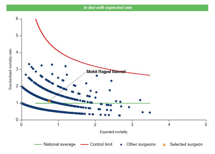 The vertical axis figures are presented as a standardised mortality ratio. This means the values do not represent percentages of patients who have died, but they represent the proportion of deaths compared to the national average. The data is also risk adjusted to take account of the fact that different surgeons may operate on more higher-risk or lower-risk patients e.g. because of demographics in the patient population they work with.
