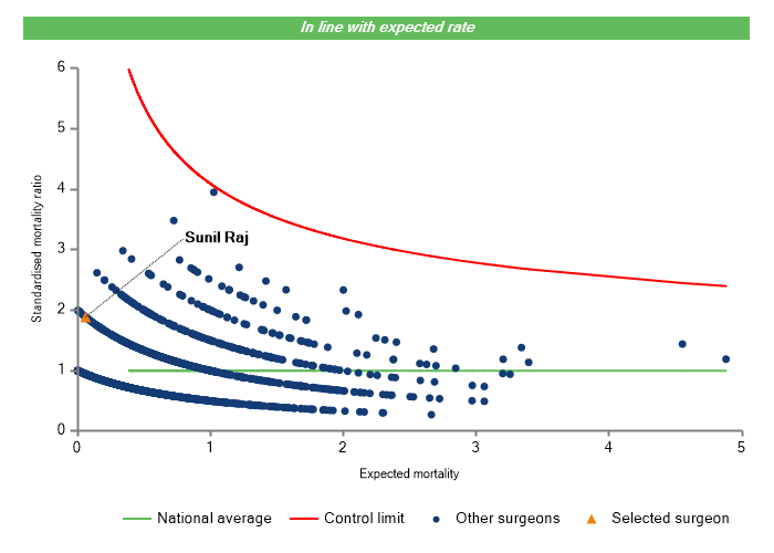 The vertical axis figures are presented as a standardised mortality ratio. This means the values do not represent percentages of patients who have died, but they represent the proportion of deaths compared to the national average. The data is also risk adjusted to take account of the fact that different surgeons may operate on more higher-risk or lower-risk patients e.g. because of demographics in the patient population they work with.